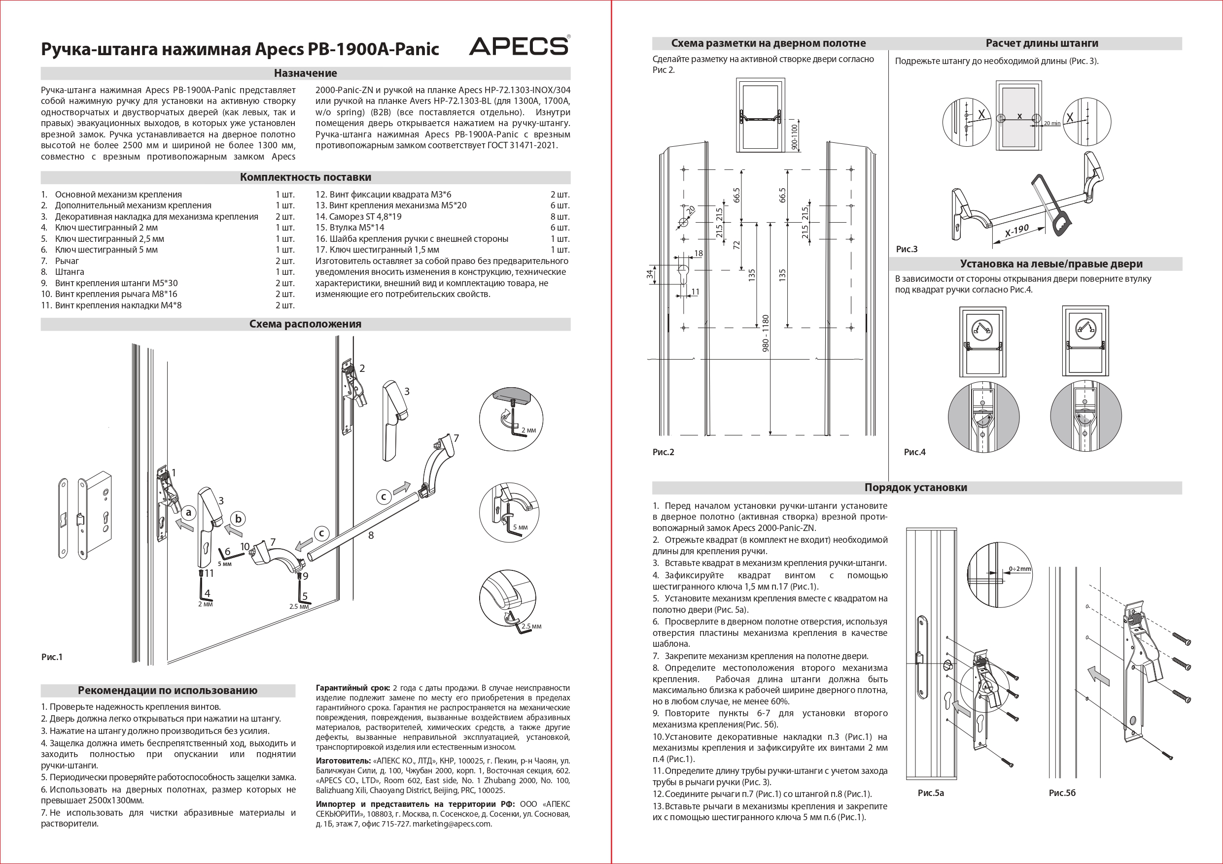 АНТИПАНИКА Ручка-штанга нажимная Apecs PB-1900A-Panic-BL/Red (9)