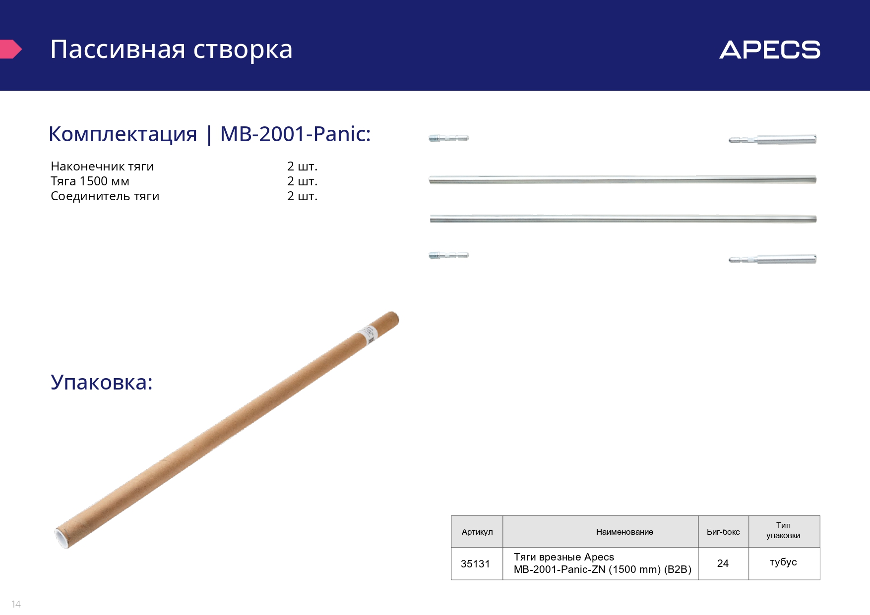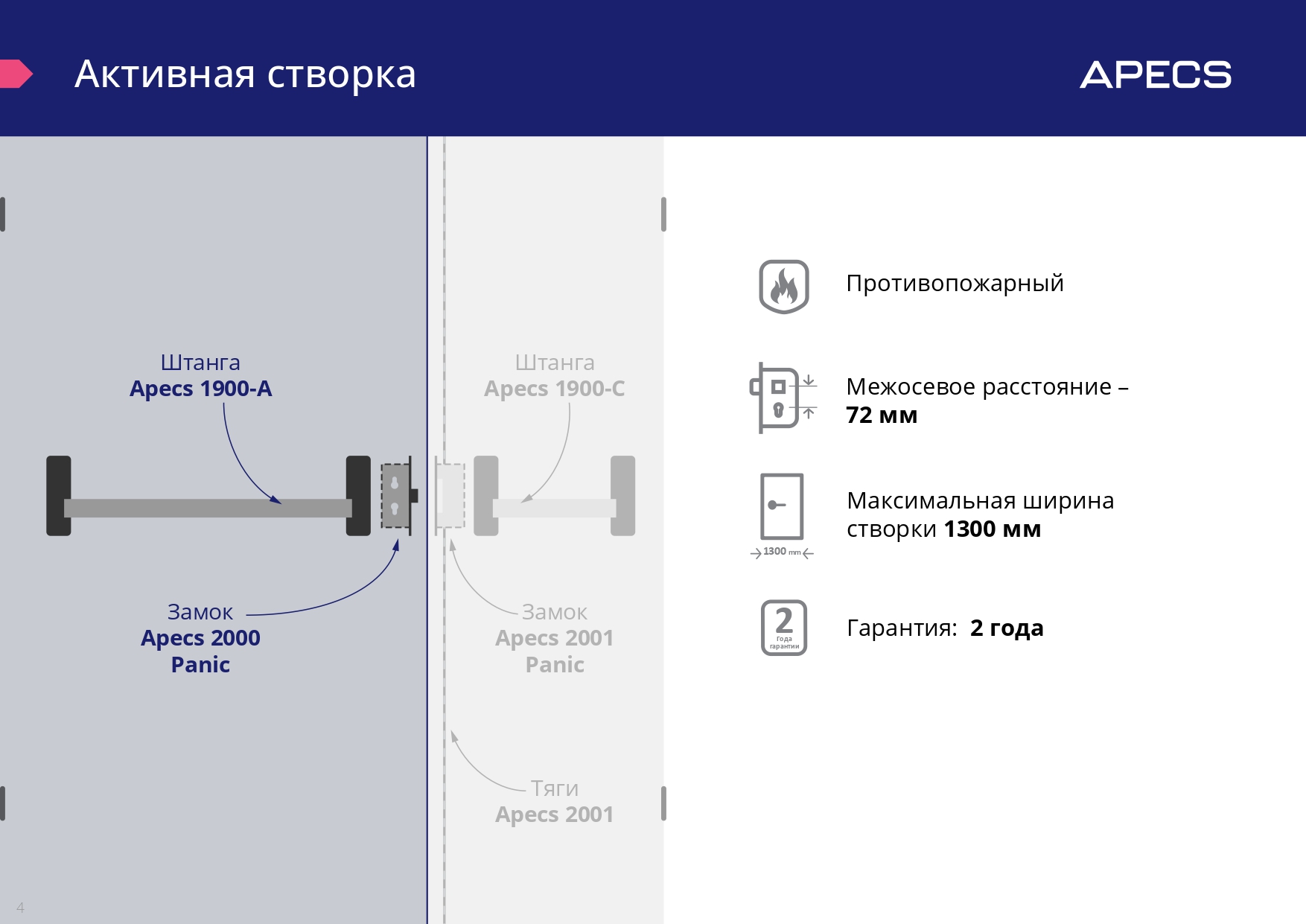 Ручки-штанги Apecs серии Actual предназначены для установки на двери эвакуационных выходов как совместно только с замками Apecs 2000 Panic (врезной способ монтажа), так и отдельно (накладной монтаж). Для отпирания двери в экстренной ситуации достаточно изнутри помещения нажать на ручку-штангу.
