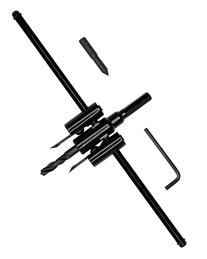 Диаметр вырезаемого отверстия регулируется перемещаемыми по горизонтальной направляющей режущими пластинами, которые могут максимально сдвинуться относительно направляющего сверла от 30 мм до 300 мм.