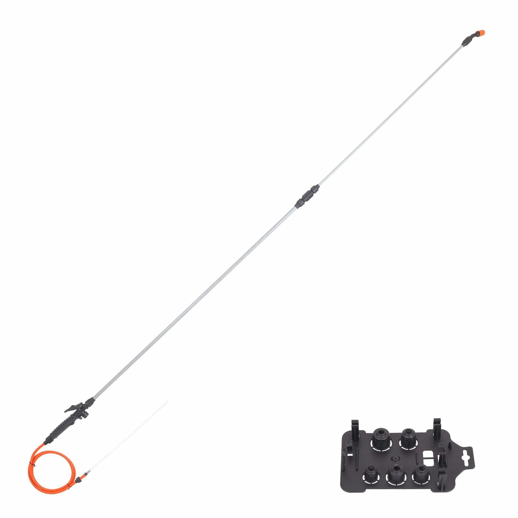 Брандспойт регулируется в длину 1260-2200 мм. Это позволяет ухаживать за растениями высотой до 5 метров, обеспечивая равномерное распыление раствора. Фиксатор на брандспойте позволяет удобно работать без удерживания кнопки. Регулировка струи обеспечивает большой радиус действия и дает возможность выбирать подходящий режим - от сильной струи до легкого тумана.