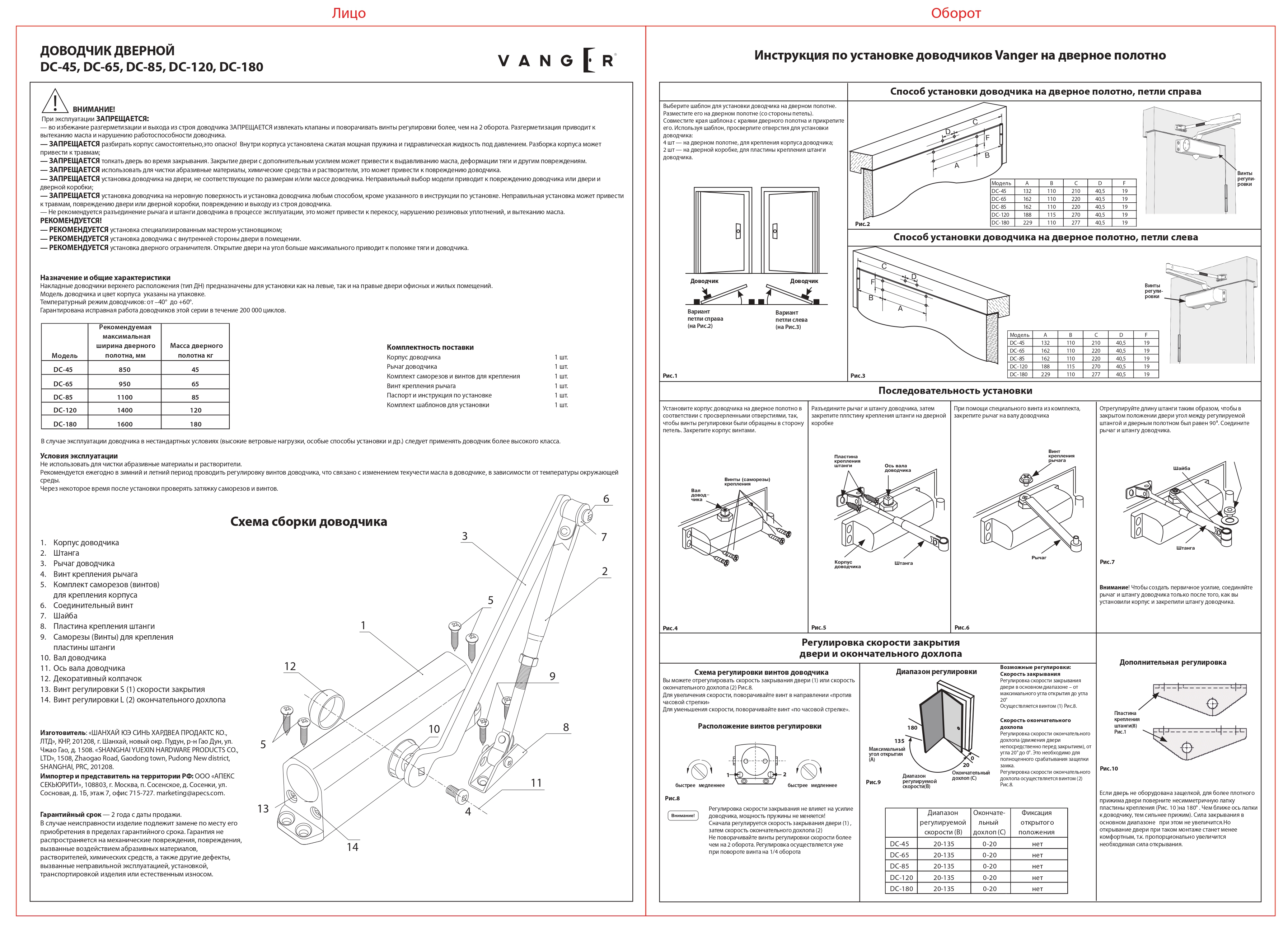 2. Важно правильно установить доводчик (по приложенному шаблону) - от этого напрямую зависит срок службы. Также настоятельно рекомендуем устанавливать доводчики только внутри помещения для его нормального функционирования.