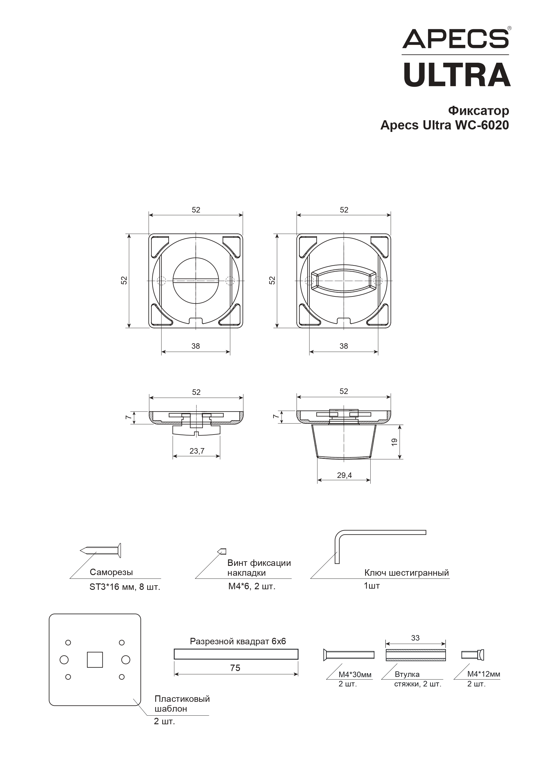 Тип крепления Стяжки M4 12(33)30 - 2 шт, саморезы SТ3*20 - 8 шт, винт фиксации - 2шт, ключ шестигранный - 1 шт.