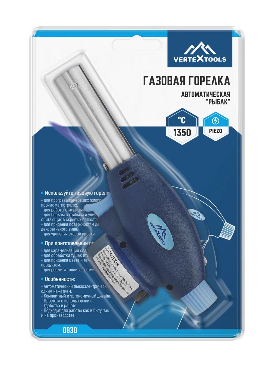 Газовая горелка с пьезоподжигом vertextools рыбак 0830 работает на пропан-бутане и имеет расширенное сопло из стали. Корпус изделия выполнен из высокопрочной пластмассы.