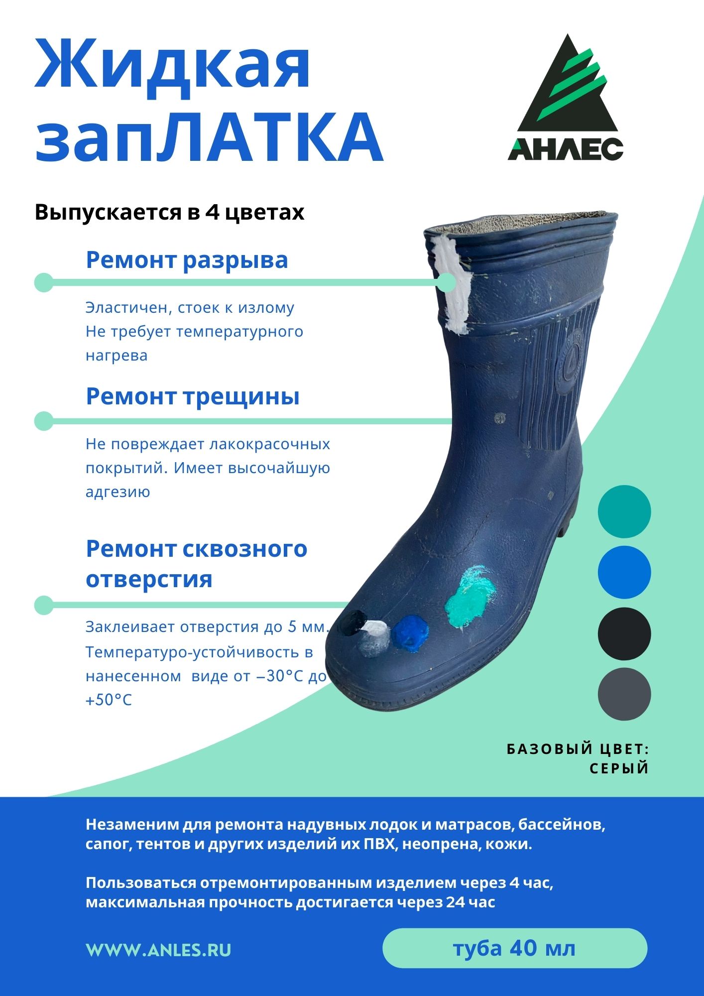 Позволяет заклеить отверстия до 5 мм , порезы, трещины.