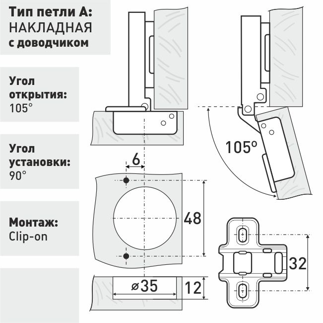 Петля мебельная накладная с доводчиком Clip-On "SOLLER" (арт.2009) (100)