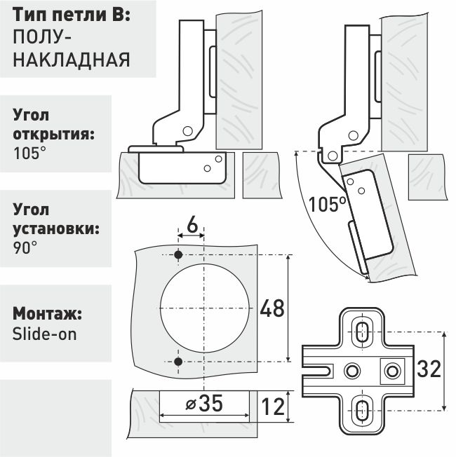 Петля мебельная полунакладная "SOLLER" (арт.362AB) (250)