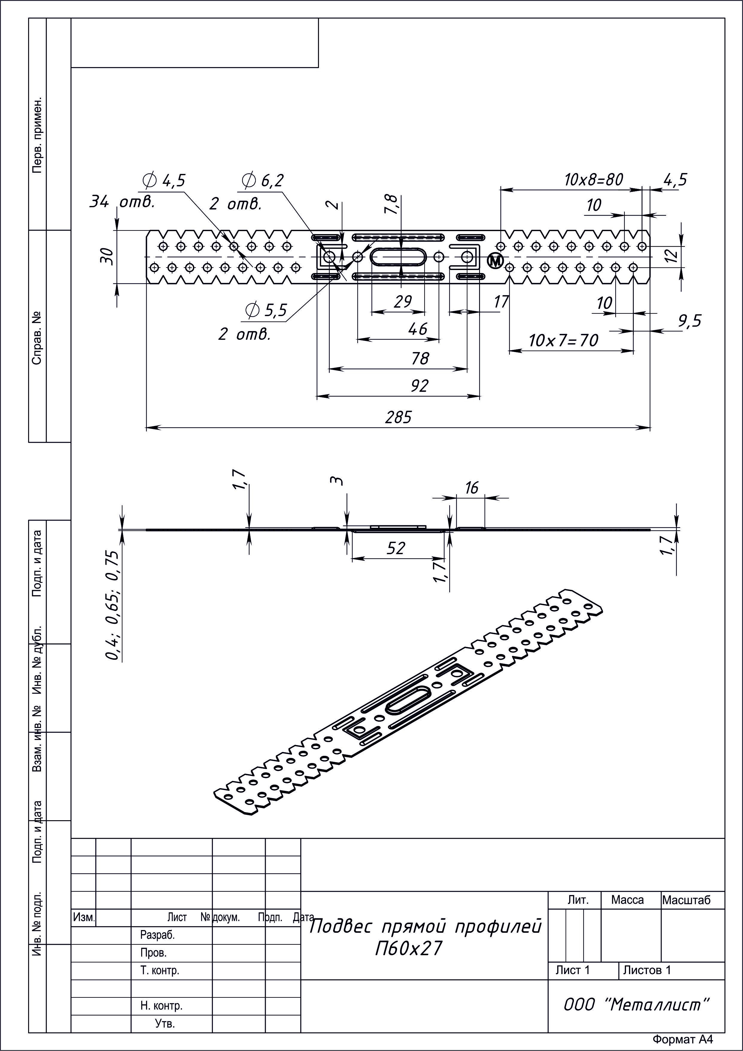 Подвес профилей прямой П60х27х300мм (0,8мм) цинк г.Кунгур (250)
