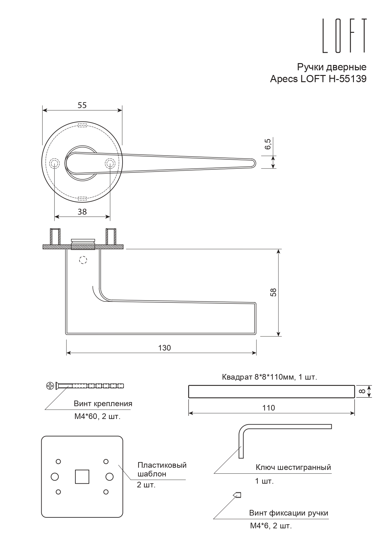Тип крепежа Пластиковый шаблон – 2 шт, Винт крепления M4*60 – 2шт, Винт фиксации – 2шт, Ключ шестигранный – 1 шт