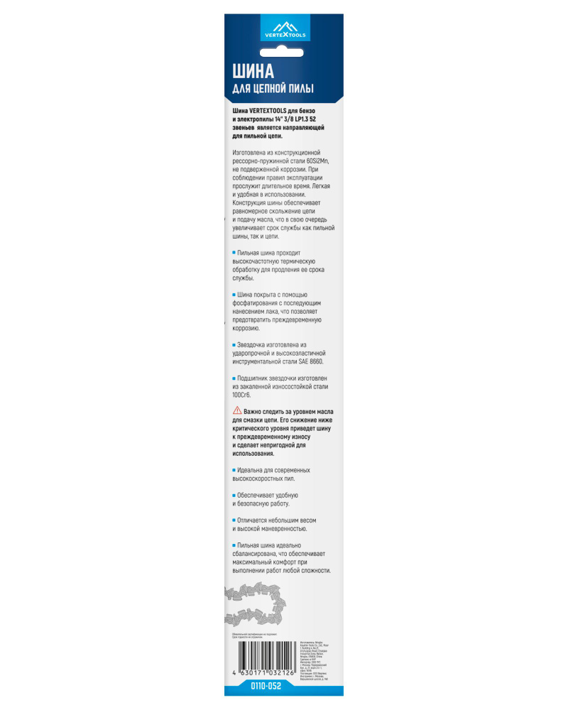 Шина VERTEXTOOLS для бензо и электропилы 14" 3/8 LP1.3 52 звеньев является направляющей для пильной цепи.Изготовлена из конструкционной рессорно-пружинной стали 60Si2Mn, не подверженной коррозии. При соблюдении правил эксплуатации прослужит длительное время. Легкая и удобная в использовании. Конструкция шины обеспечивает равномерное скольжение цепи и подачу масла, что в свою очередь увеличивает срок службы как пильной шины, так и цели.