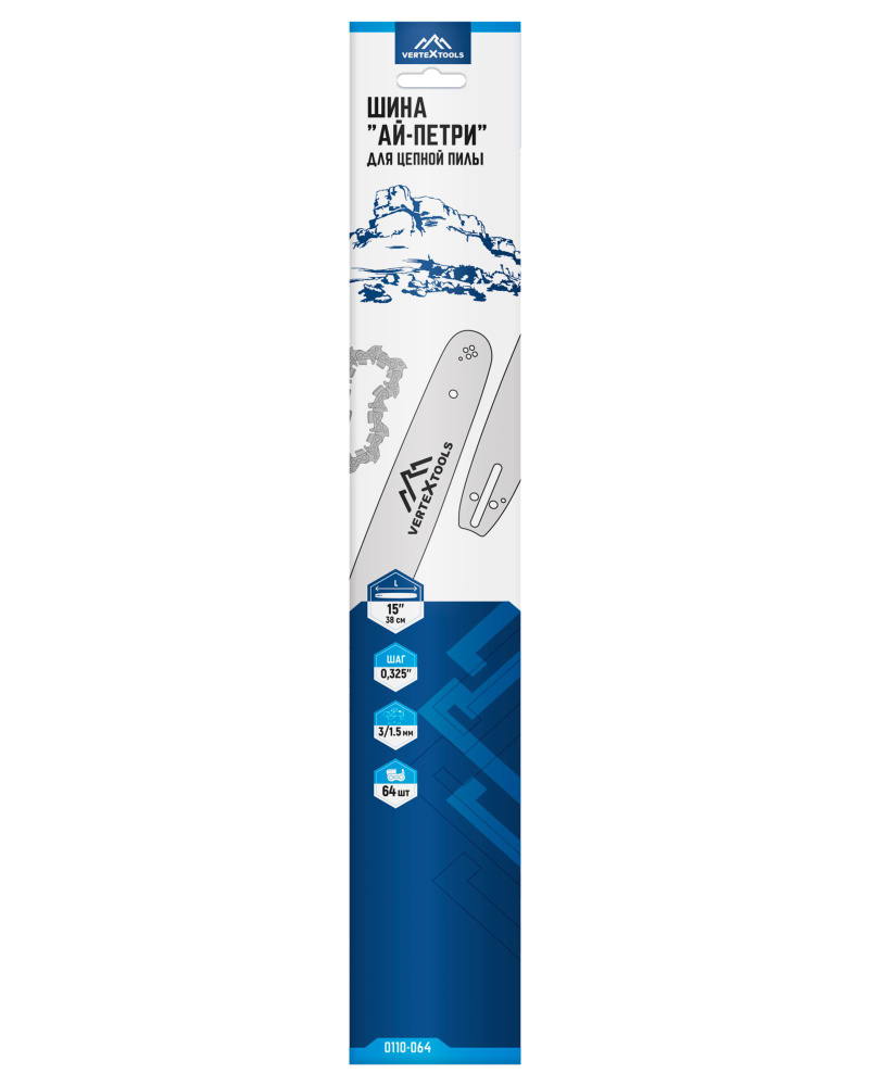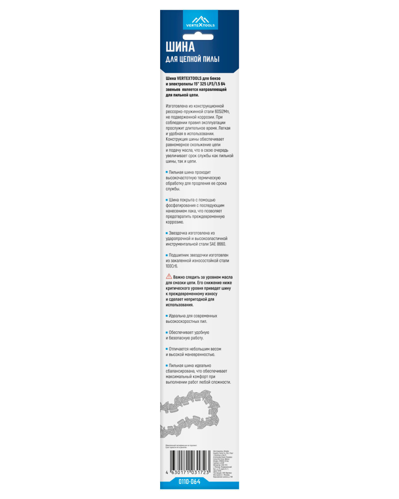 Шина VERTEXTOOLS для бензо и электропилы 15" 0,325" LP 3/1.5 64 звеньев является направляющей для пильной цепи.Изготовлена из конструкционной рессорно-пружинной стали 60Si2Mn, не подверженной коррозии. При соблюдении правил эксплуатации прослужит длительное время. Легкая и удобная в использовании. Конструкция шины обеспечивает равномерное скольжение цепи и подачу масла, что в свою очередь увеличивает срок службы как пильной шины, так и цели.