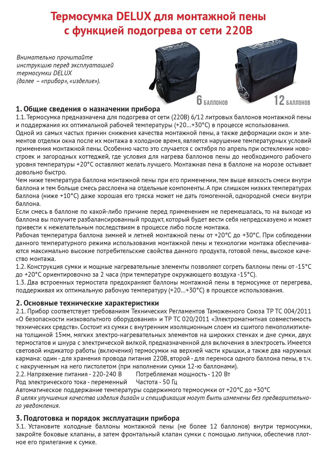 Конструкция сумки и нагревательные элементы позволяют согреть баллоны пены от -15°С до +20°С ориентировочно за 2 часа (при температуре окружающего воздуха -15°С).