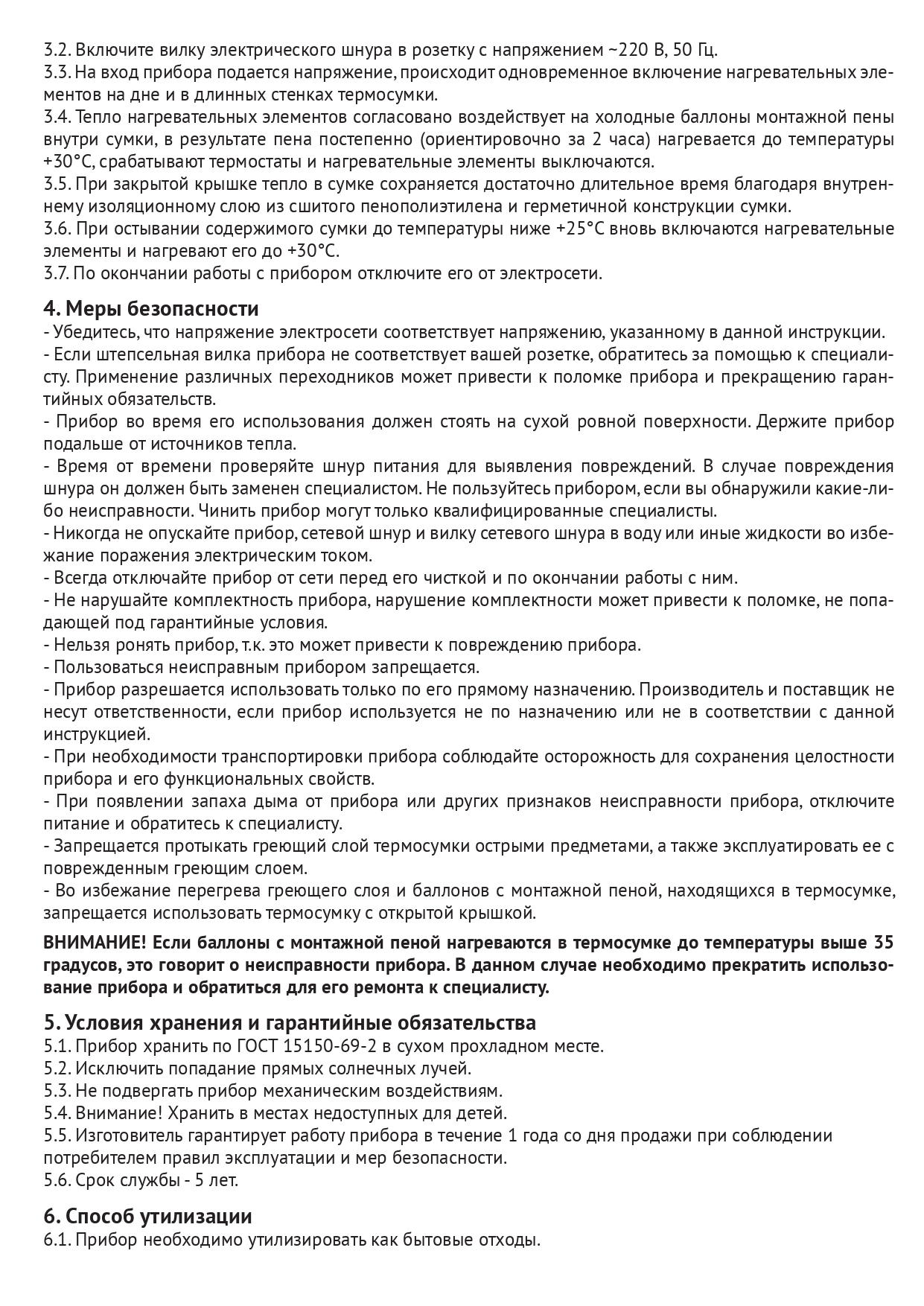 3.4. Тепло нагревательных элементов согласованно воздействует на холодные баллоны монтажной пены внутри сумки, в результате пена постепенно (ориентировочно за 2 часа) нагревается до температуры +30°C, срабатывают термостаты и нагревательные элементы выключаются.