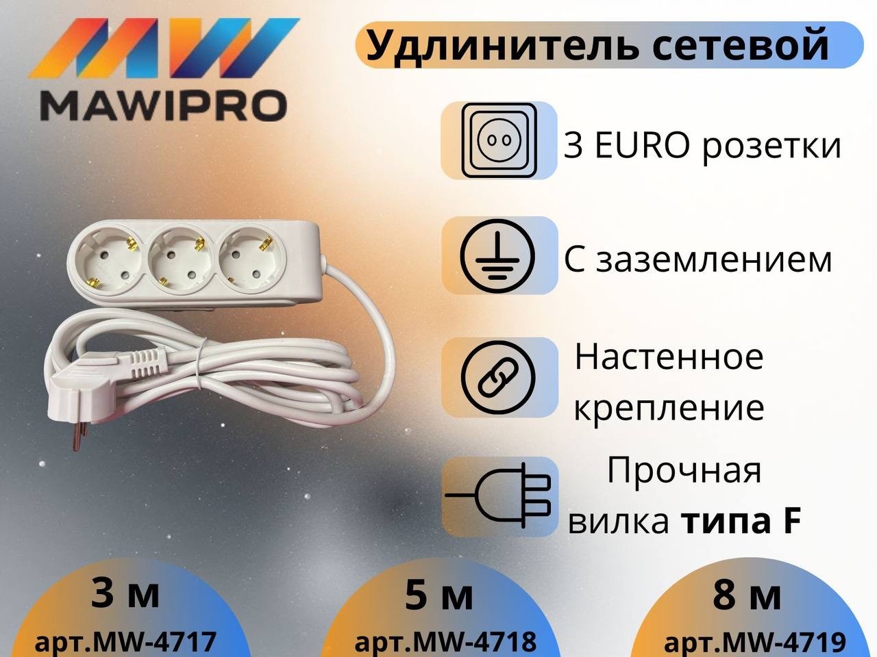 --Удлинитель сетевой "MAWIPRO" 3м (3 розетки с/з ПВС 3х1) (60)Антены телевизионыеСкобы электроустановочные.ВентиляторыШнур сетевойTV штекеры, аудио шнуры, телефонияАвтоматы, УЗОБатарейкиКабель, проводЛампыЗвонки, кнопки для звонкаНасосыПатроныСветильники прожектораПаяльники, расходники и акссесуарыСетевые фильтрыТеплообогреватели, конвекторыТройники, переходники, колодки, вилкиТЭНЫ и комплектующиеУдлинителиФонарикиЭЛ. ПЛИТЫ, Зажигалки, Кипятильники, ЧайникиСветильники- переноскиЭлектро установочная фурнитура.Электроустановка