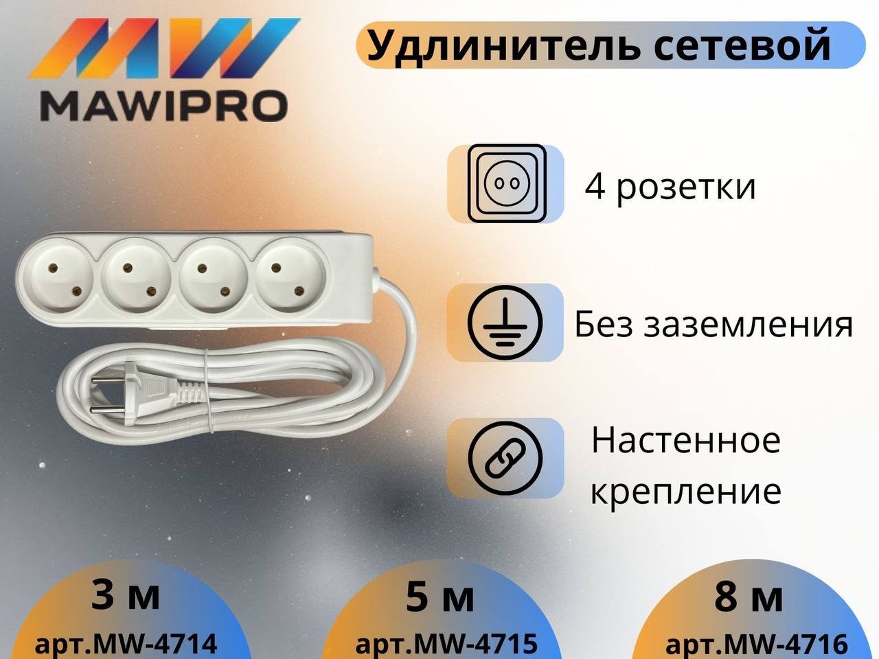 Удлинитель сетевой "MAWIPRO" 8м (4 розетки б/з ПВС 2х1) (40)