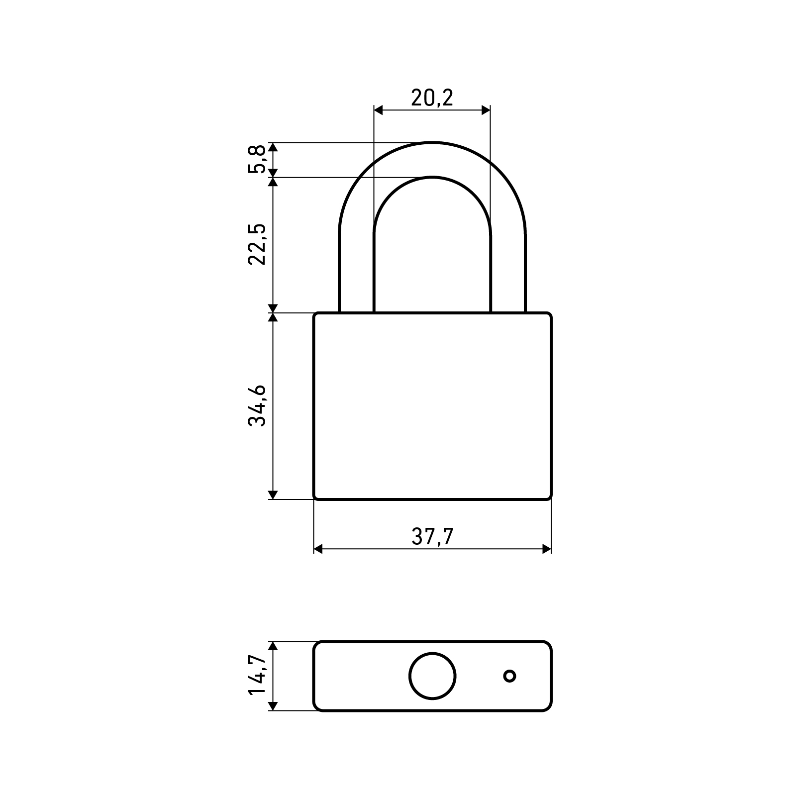 Замок навесной цилиндровый общего применения с классической дужкой. Используются на дверях, оборудованных проушинами. Материал корпуса - чугун. Размер корпуса 37,7х34,6х14,7 мм. В корпусе предусмотрено отверстие для отвода влаги. Стальная закаленная дужка диаметром 5,8 мм., с гальваническим покрытием имеет фиксацию с двух сторон. Проём дужки по высоте: 22,5 мм., проём дужки по ширине: 20,2 мм. Замок запирается автоматически при нажатии на дужку без использования ключа. Замок оснащен латунным цилиндровым механизмом секрета с 4 ключами. Гарантийный срок – 3 года.