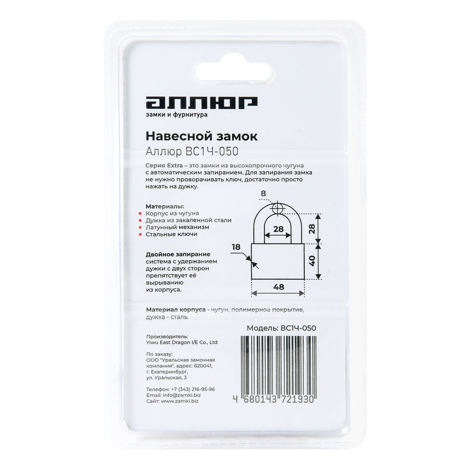 Замок навесной Аллюр EXTRA ВС1Ч-050 (4 ключа) (12/72)
