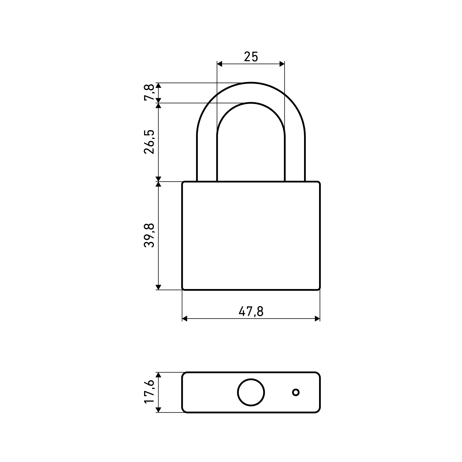 Замок навесной цилиндровый общего применения с классической дужкой. Используются на дверях, оборудованных проушинами. Материал корпуса - чугун. Размер корпуса 47,8х39,8х17,6 мм. В корпусе предусмотрено отверстие для отвода влаги. Стальная закаленная дужка диаметром 7,8 мм., с гальваническим покрытием имеет фиксацию с двух сторон. Проём дужки по высоте: 26,5 мм., проём дужки по ширине: 25 мм. Замок запирается автоматически при нажатии на дужку без использования ключа. Замок оснащен латунным цилиндровым механизмом секрета с 4 ключами. Гарантийный срок – 3 года.