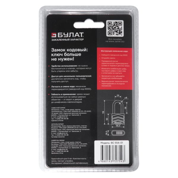 Замок навесной БУЛАТ 554-01 d=8мм КОДОВЫЙ (24/6)