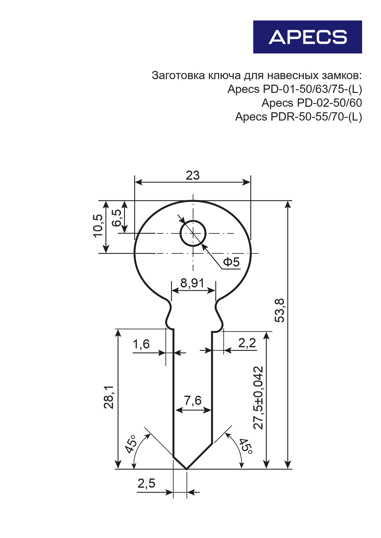 Заготовка ключа PD-01 - для навесных замков Apecs серий: