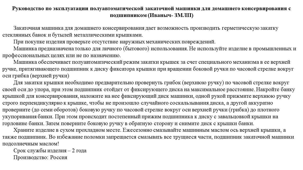 Храните изделие в сухом прохладном месте. Ежесезонно смазывайте машинным маслом ось верхней крышки, а также подшипник. Во избежание поломки запрещается все трущиеся части закаточной машинки подсолнечным маслом!