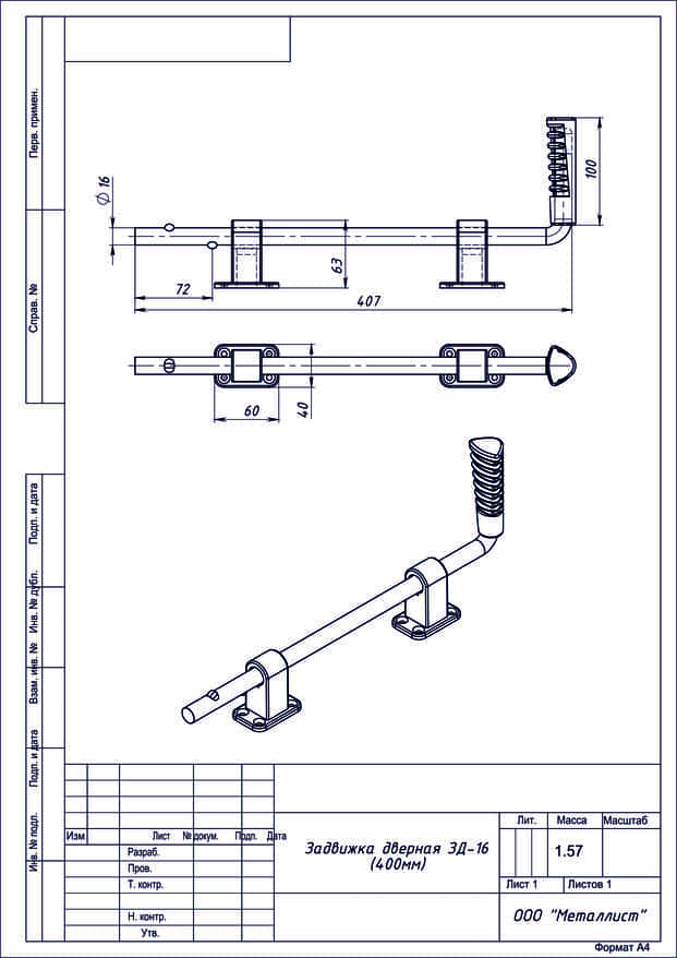 Засов без пружины ЗД-16 (400мм) цинк г.Кунгур (10)