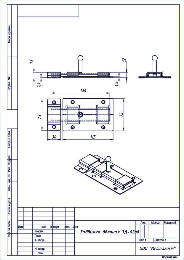 Засов накладной для деревянных и металлических дверей. Материал - цинкованная сталь. Габариты корпуса - 115х75 мм, 4 крепежных отверстия. Плоский ригель с вылетом 40 мм. В комплекте ответная планка 73х30 мм.