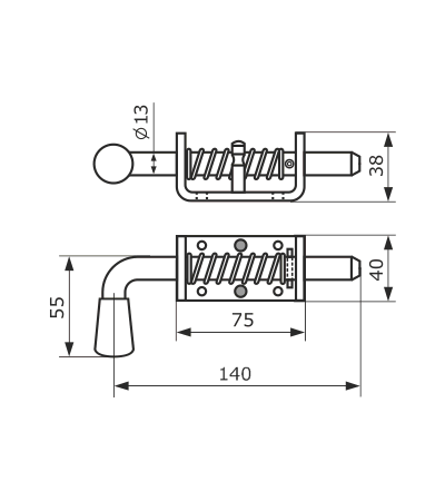 Засов пружинный (75) 140 мм. Применяется для запирания различных типов дверей и ворот. Прочный стальной корпус 75 мм. Пружина автоматически приводит засов в положение «ЗАКРЫТО».