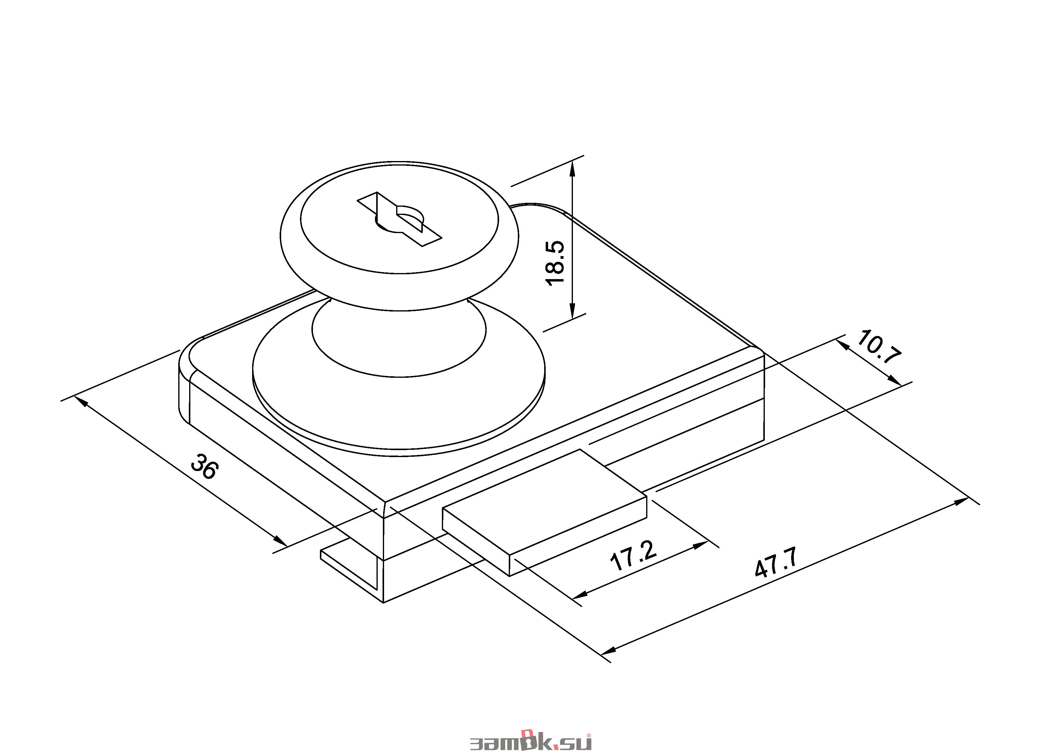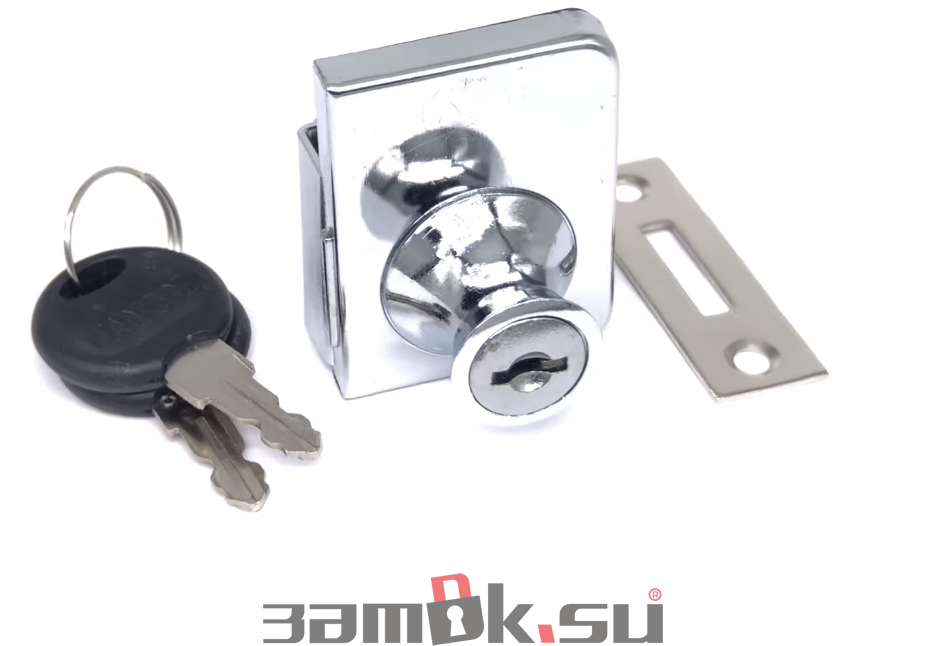Замок мебельный витринный. Используется для внутренних (вкладных) дверей. Замок надевается на кромку стекла и крепится на ней двумя винтами. Сверление стекла не требуется. Изготовлен из качественного металла и покрыт гальванической хромированной плёнкой. В комплекте 2 ключа