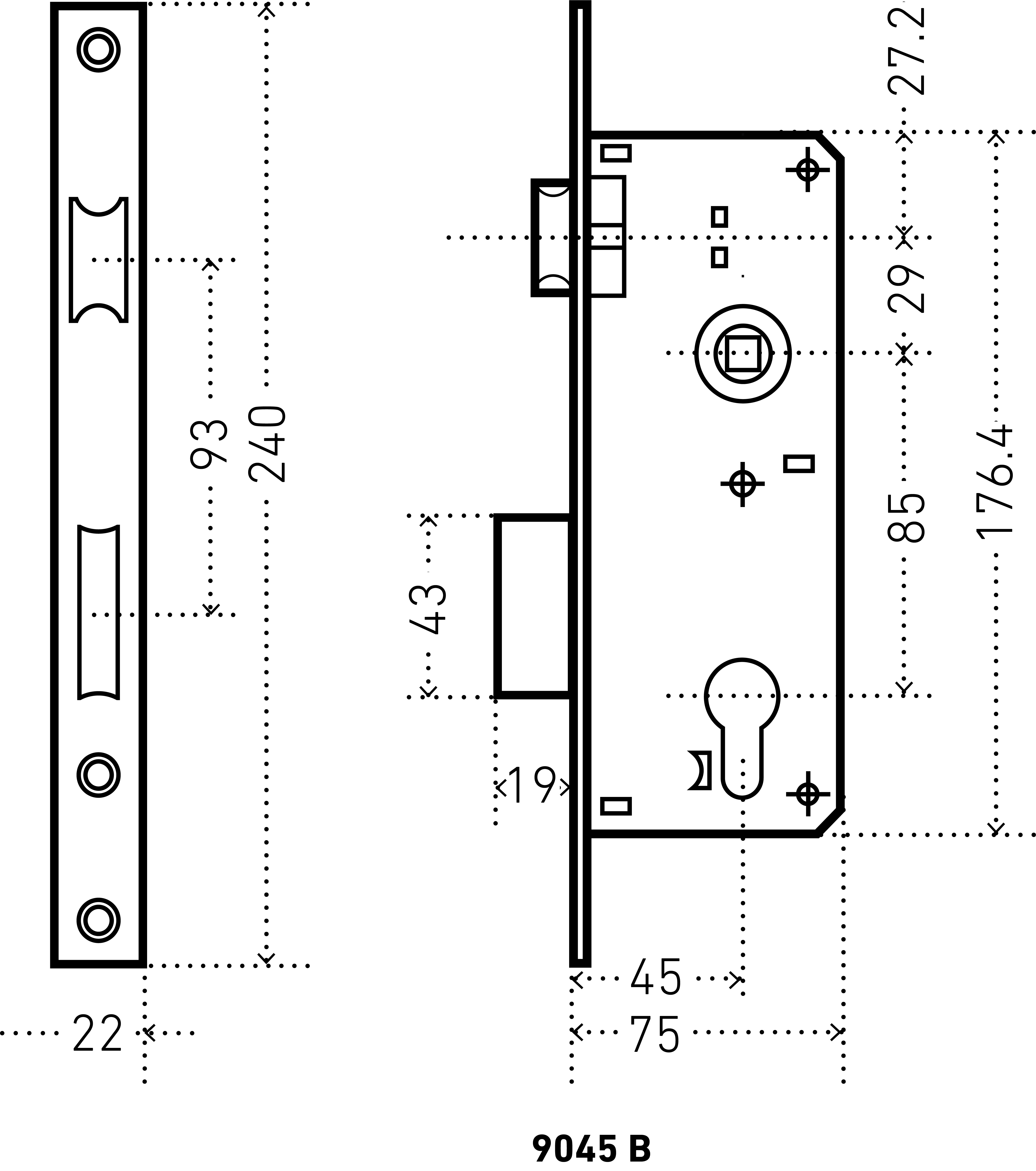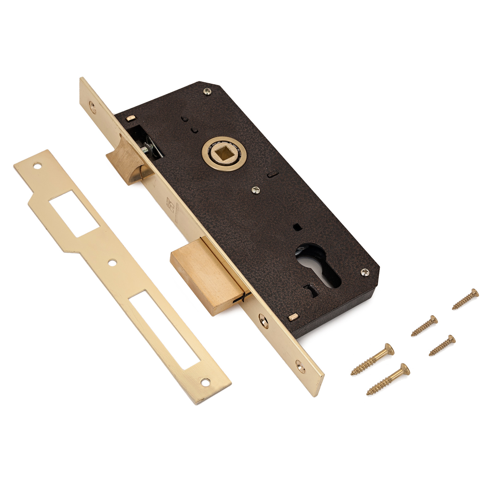 Замок врезной цилиндровый, без механизма секрета. Предназначен для установки в деревянные двери. Прямоугольный ригель, вылет 20мм. Удаление ключевого отверстия 45мм. Межосевое расстояние 85мм. Цвет торцевой планки - латунь, ширина 22мм.
