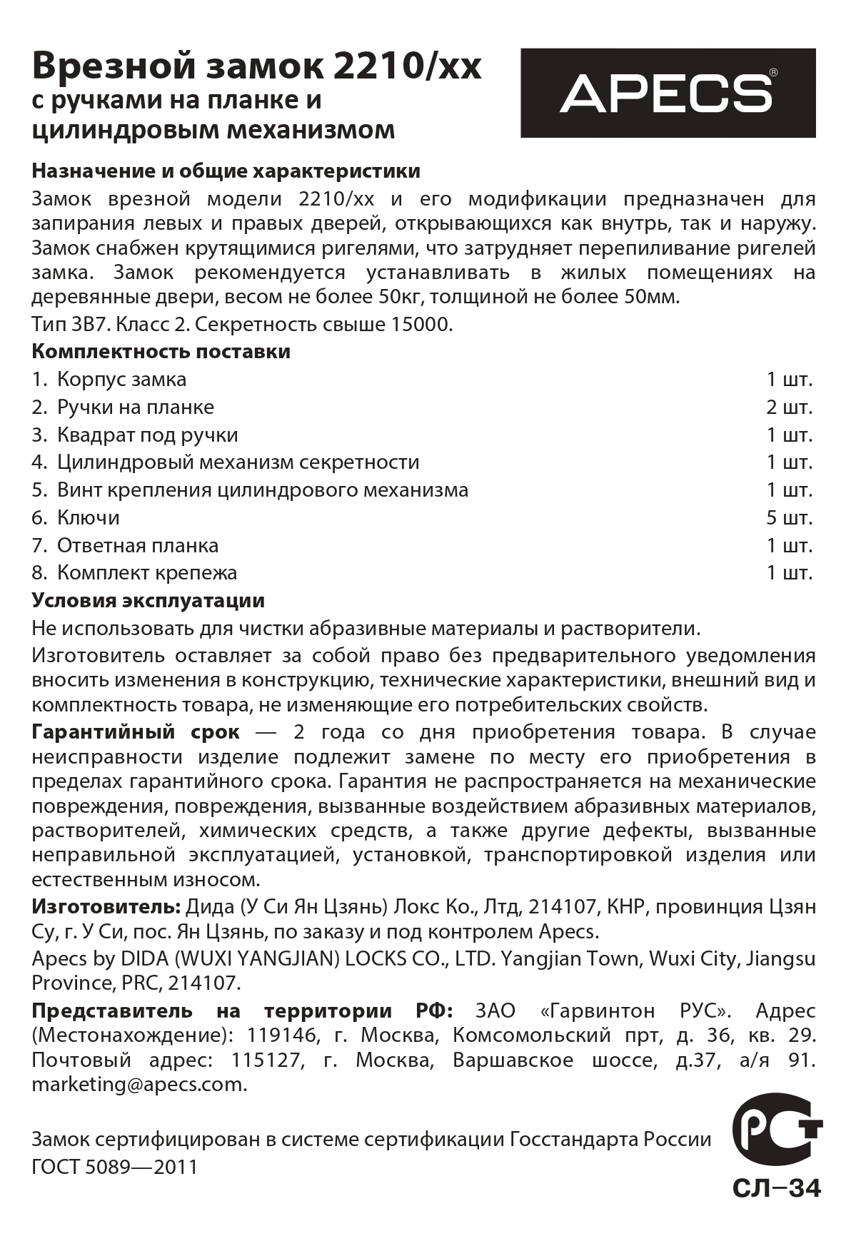 Замки имеют сертификат соответствия согласно ГОСТ 5089-2011.