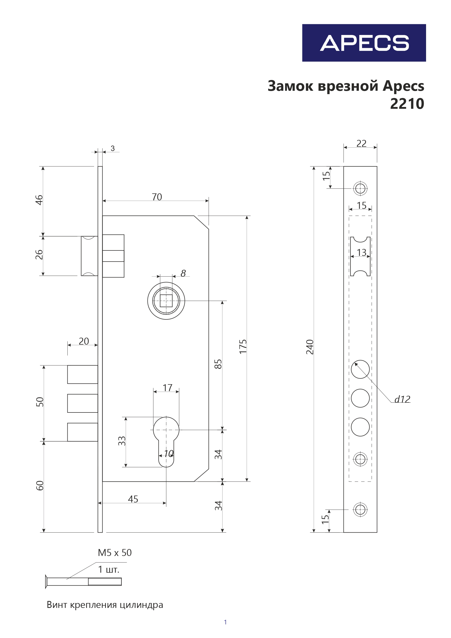 Замки Apecs серии 22 - универсальные врезные замки под ручку и евроцилиндр для деревянных межкомнатных и входных дверей с межосевым расстоянием 85 мм.