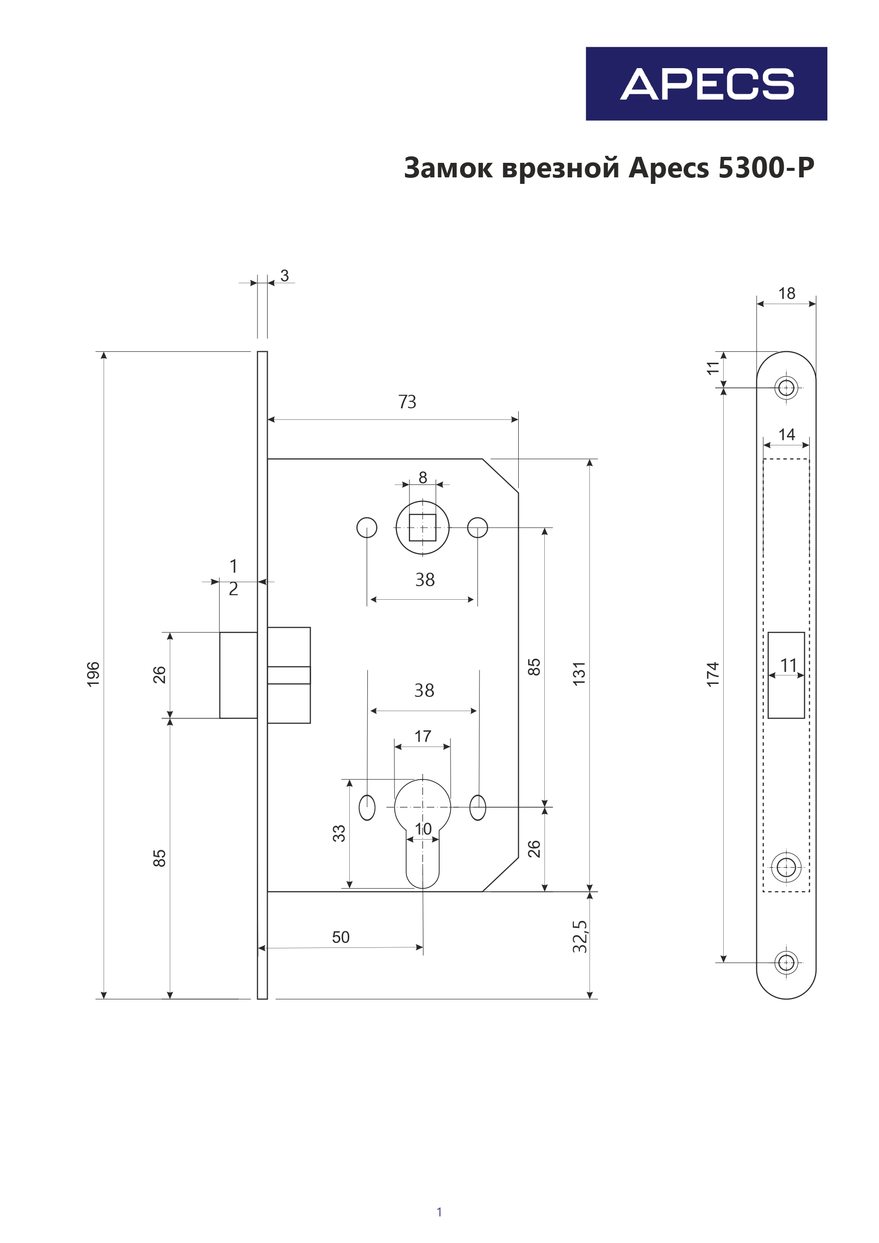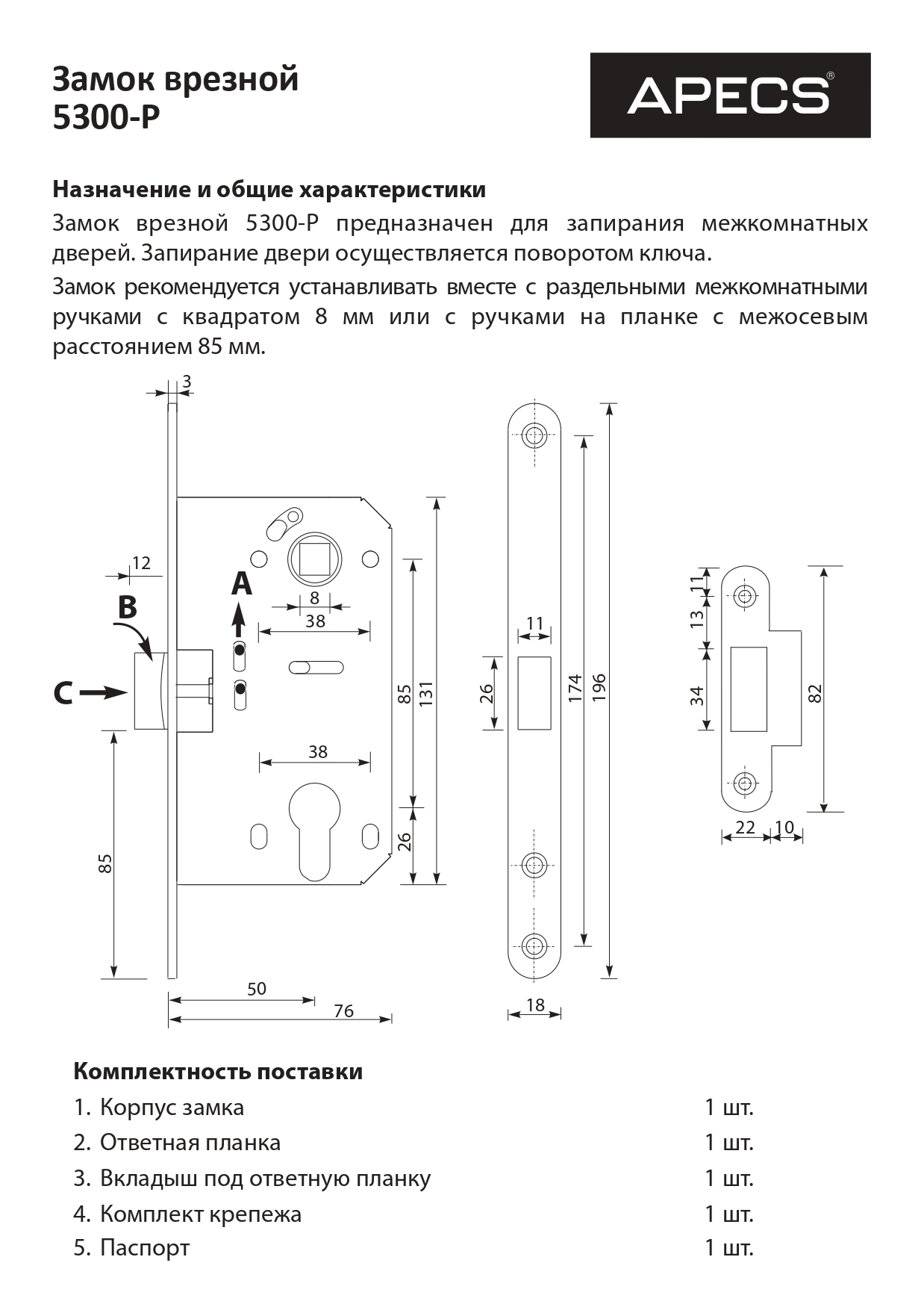 Замок врезной Apecs 5300-P-BLM с пластиковой защелкой под цилиндровый механизм (черный матовый) (5/40)
