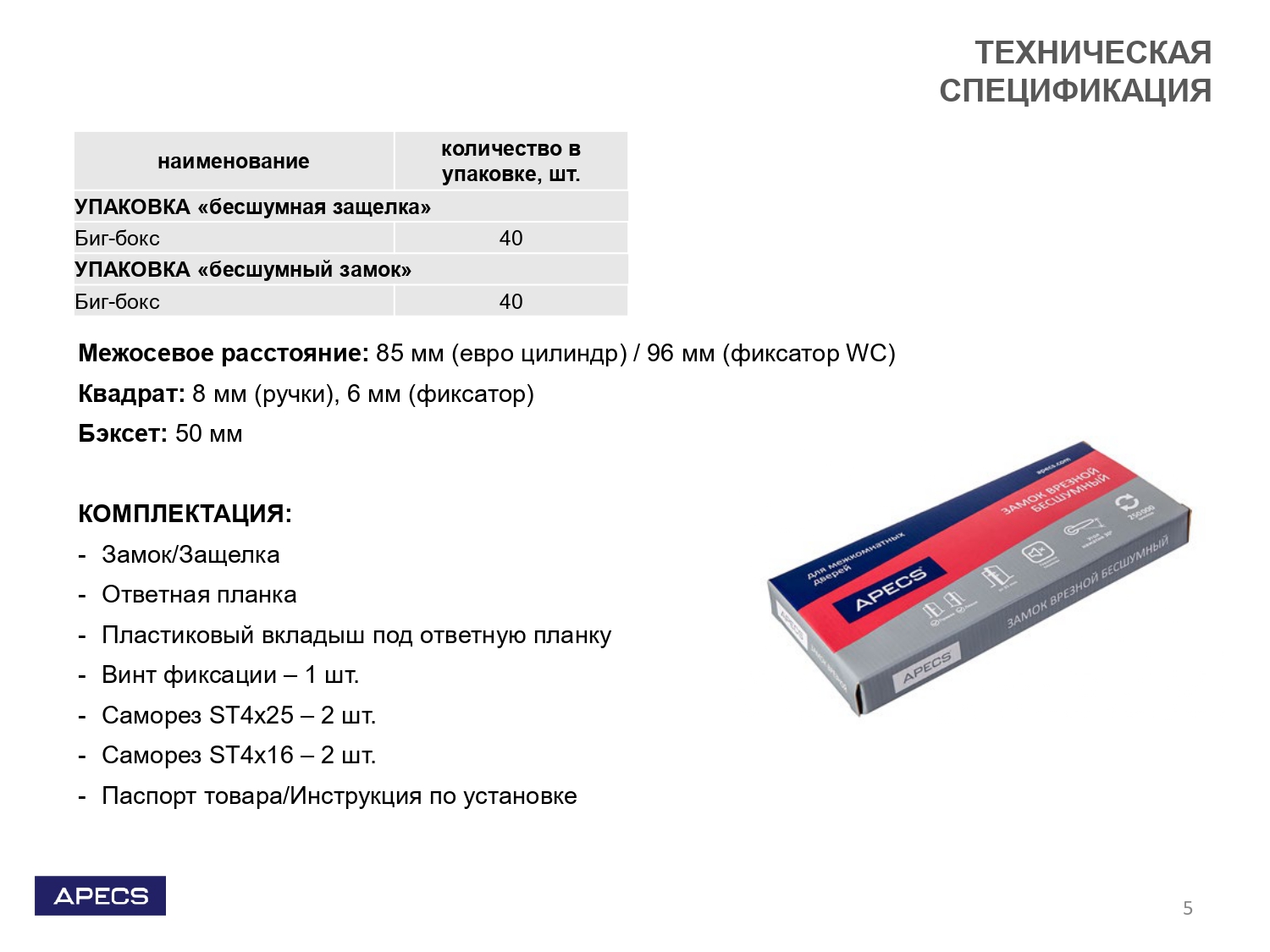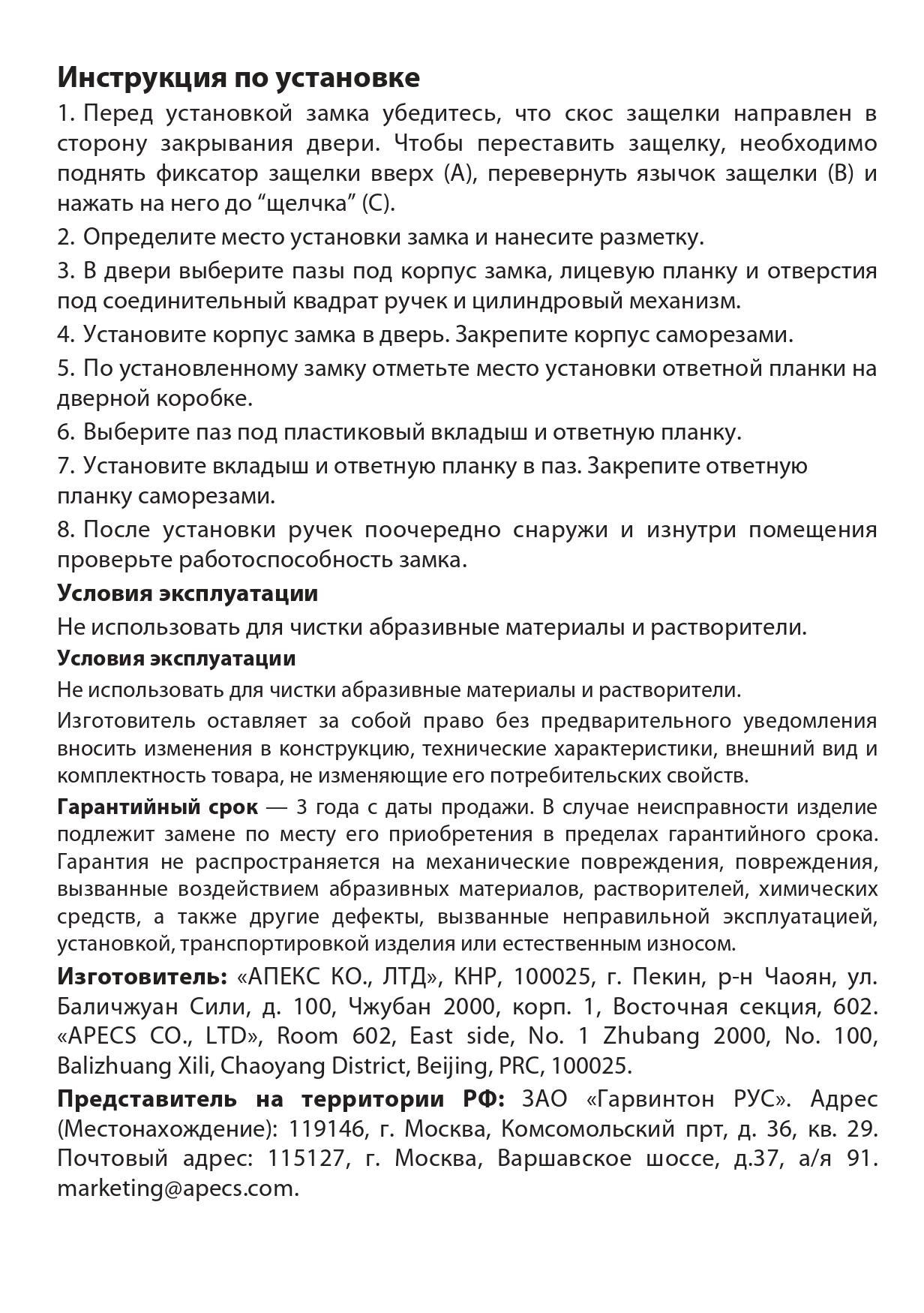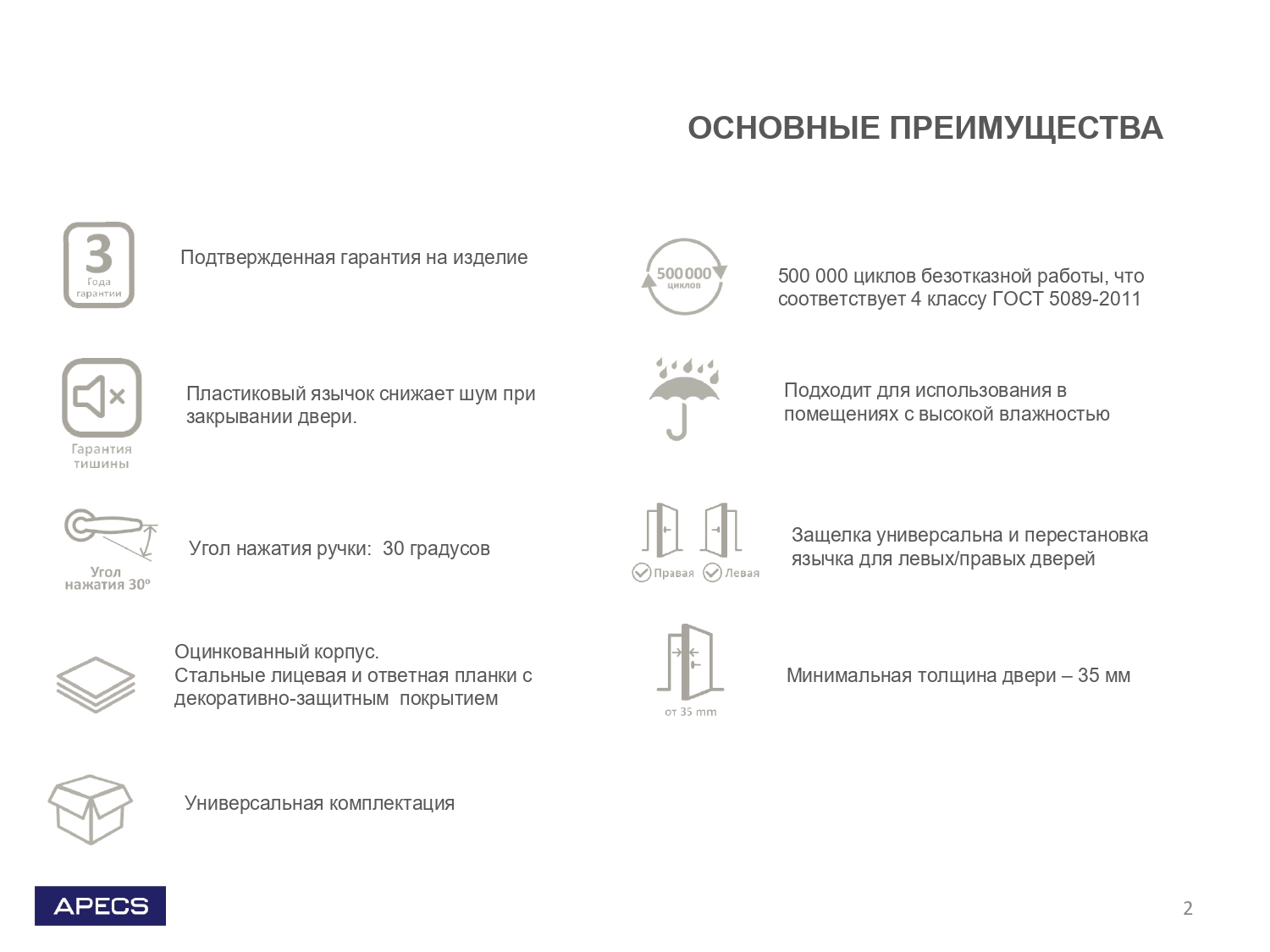 500 000 циклов безотказной работы. Соответствие ГОСТ 5089-2011 подтверждено сертификатом. Устанавливаются совместно с дверными ручками. Замки под евроцилиндр могут комплектоваться накладками под цилиндр, защелки WC - фиксаторами WC для ванной/туалета.