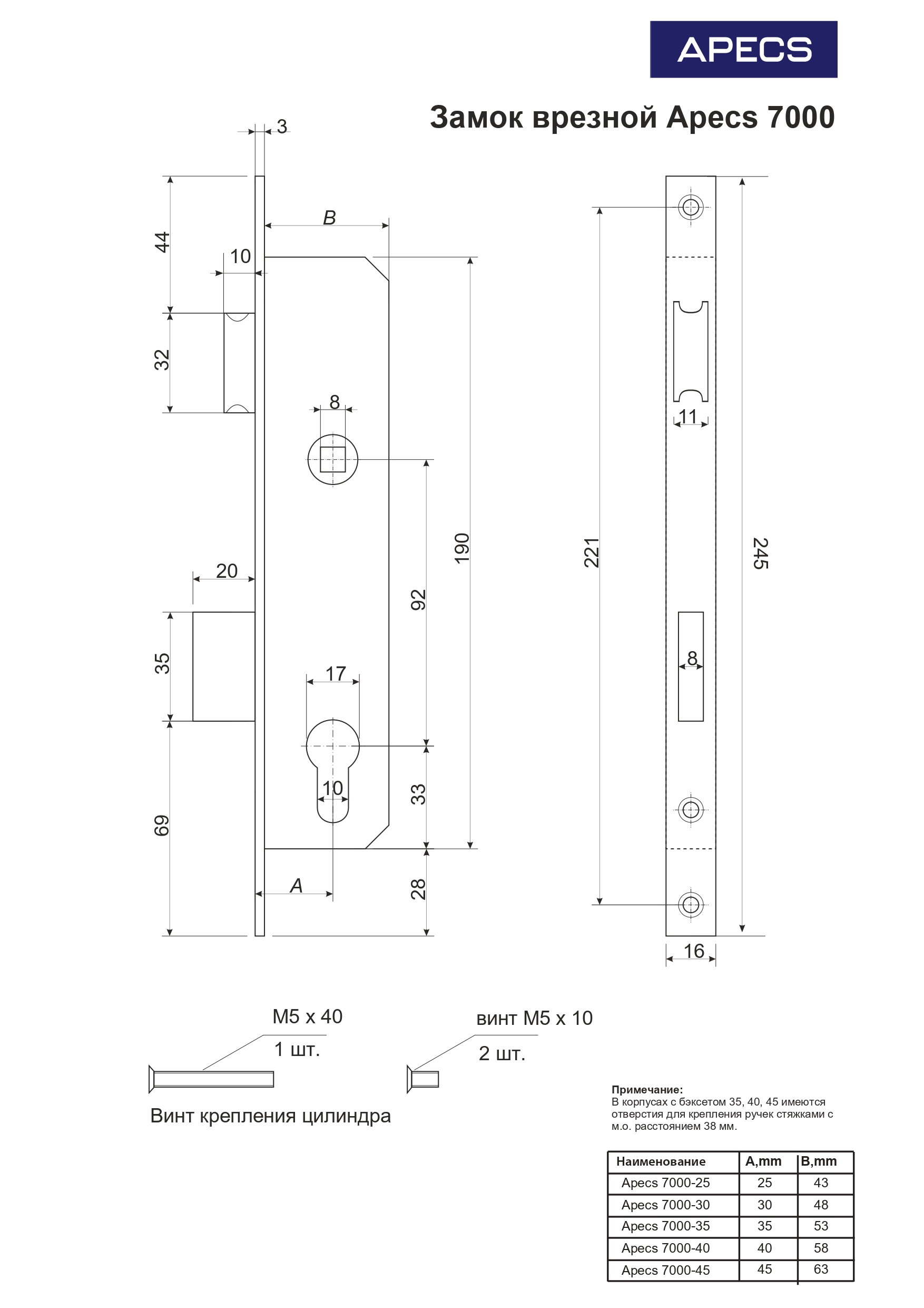 В корпусах с Backset 35, 40, 45 мм имеются отверстия для крепления раздельных ручек стяжными винтами, посадочный размер 38 мм.