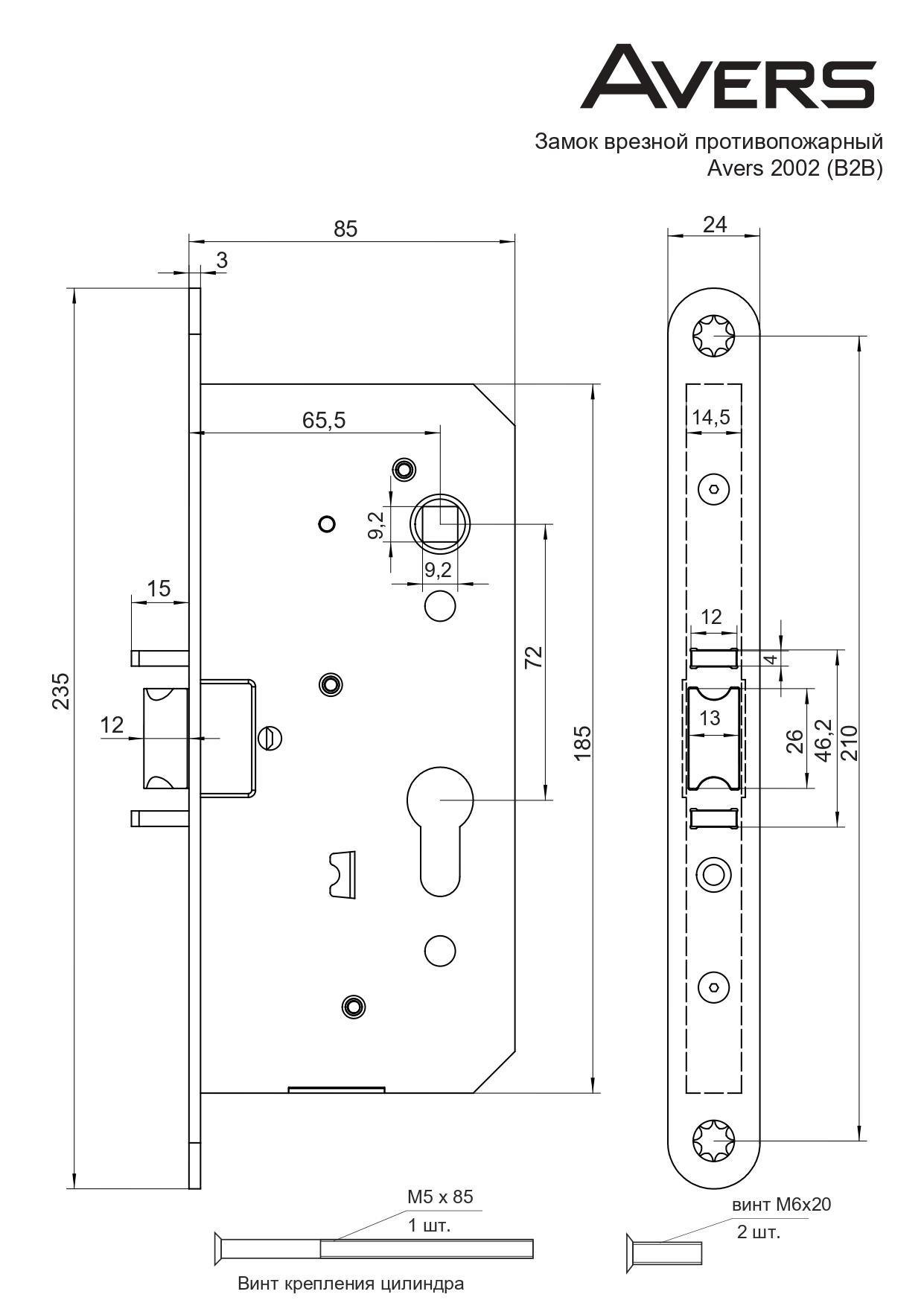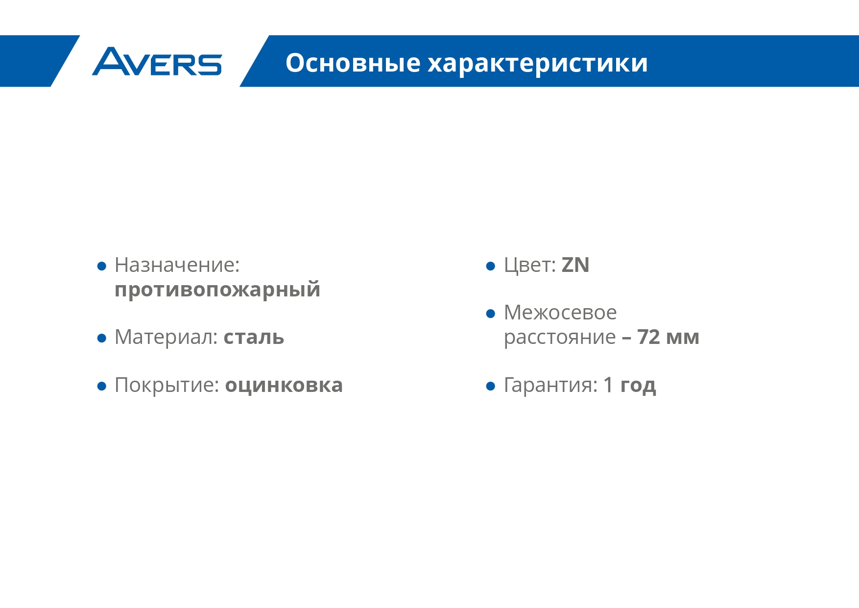 Противопожарные замки Avers с межосевым расстоянием 72 мм предназначены для установки в сертифицированные деревянные и металлические противопожарные двери.