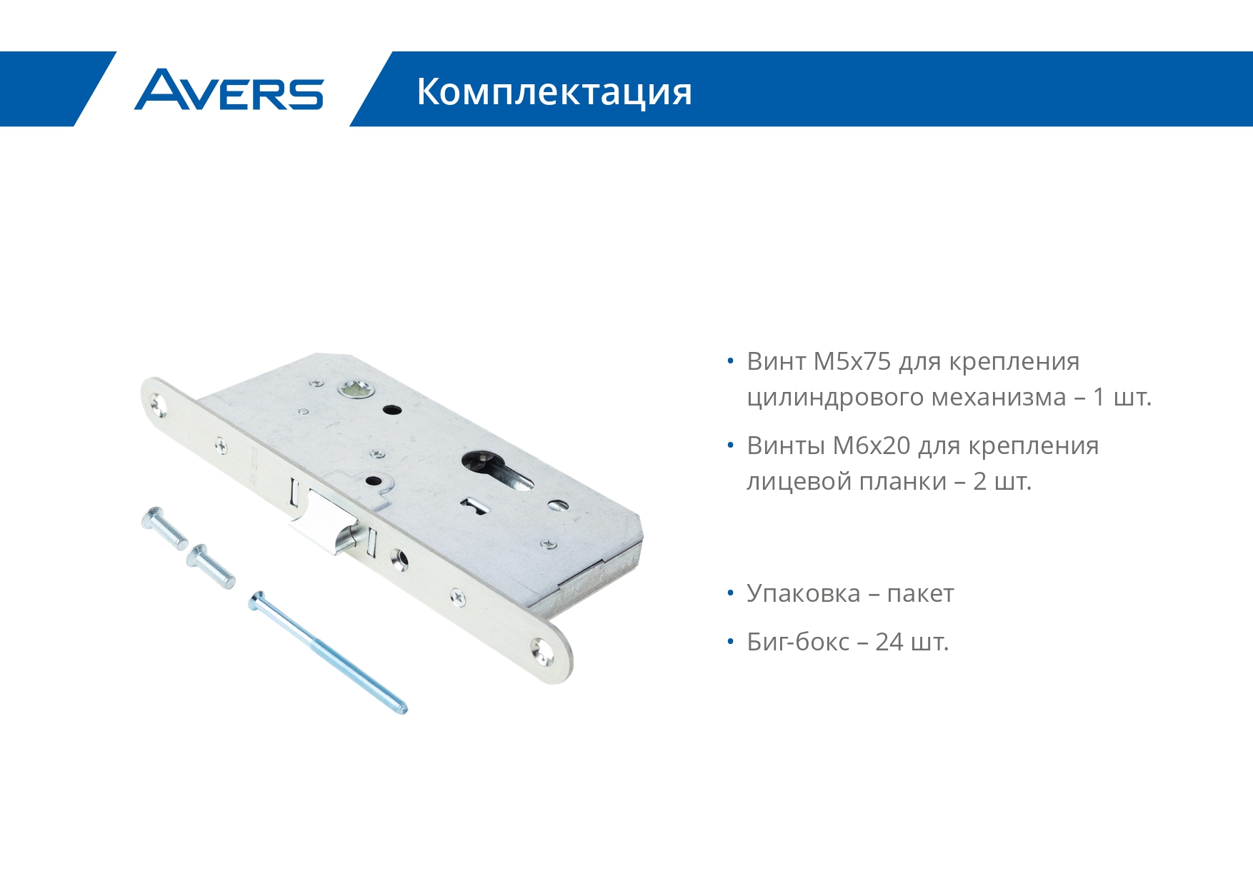 Комплектация: Винт М5х75 для крепления цилиндрового механизма; Винты М6х20 для крепления лицевой планки; Заглушка