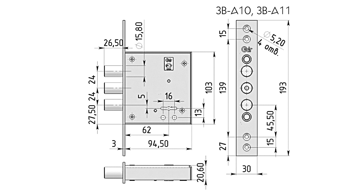 Диаметр штырей засова 15,8 мм;