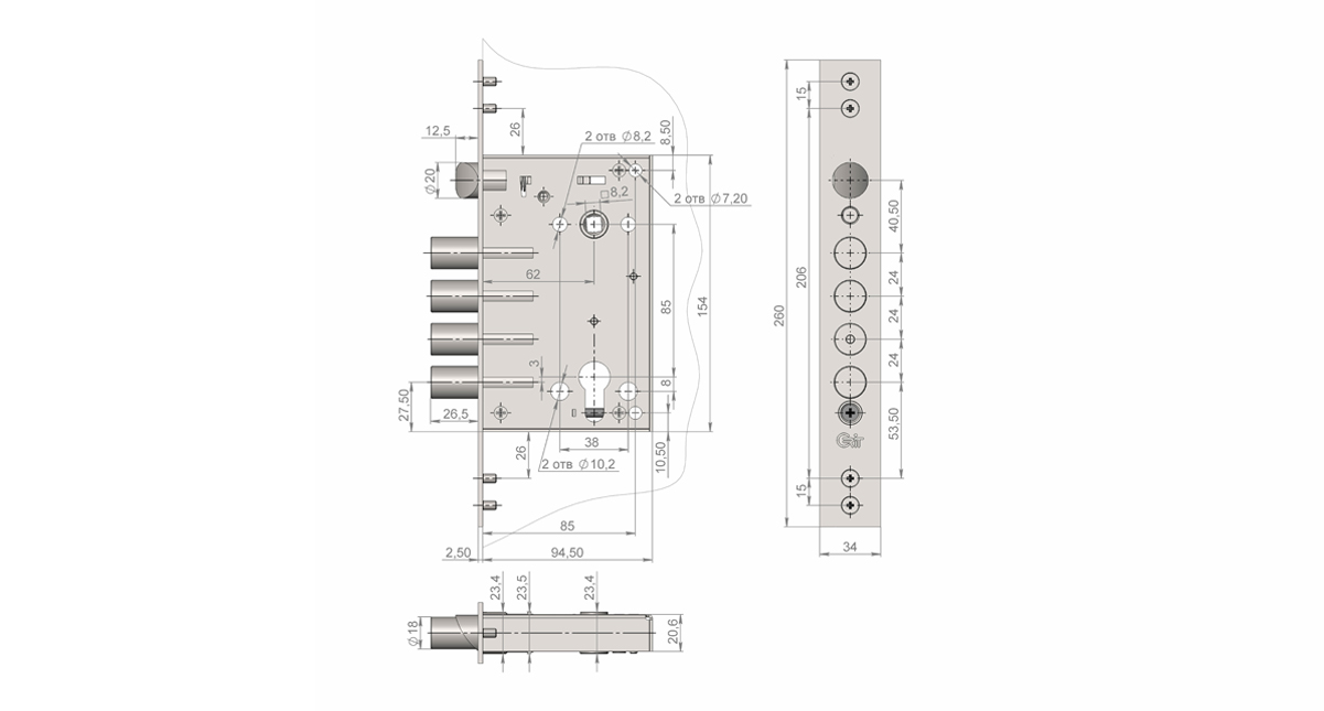 Кроме основных отверстий крепления к двери через планку, представленная модель оборудована дополнительными отверстиями в корпусе, предоставляющими возможность еще более надежно закрепить корпус замка непосредственно к панели двери.